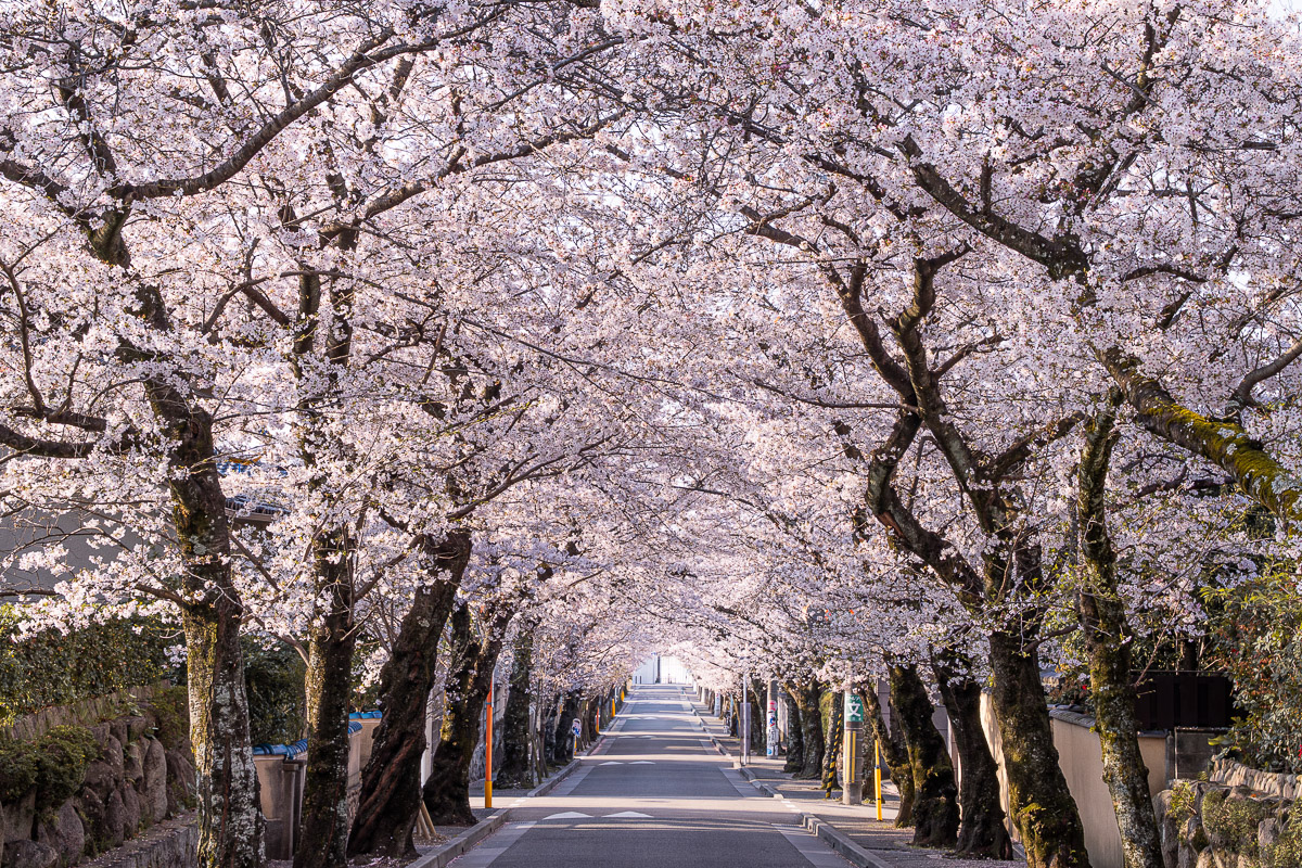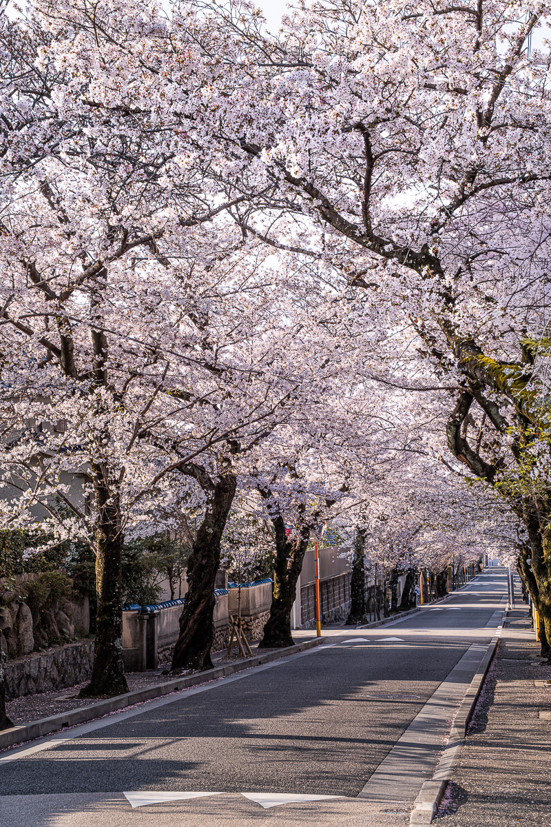 路面全体を柔らかく包む木漏れ日が心地よく、地元の人たちが散歩を楽しむ穏やかな風景と、このエリア特有の凛とした空気感のなかに、淡いピンクのトンネルが静かに溶け込んでいます。
